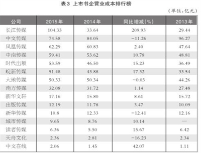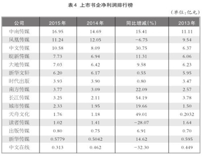 15家上市书企以同比17.63%的增速实现799.56亿元的年度总营业收入(见表2)。其中突破百亿的长江传媒、中文传媒、中南传媒、凤凰传媒的营业收入合计占比也高达54.56%,而凤凰传媒、中文传媒、中南传媒更是率先实现了资产规模和营业收入双百亿的目标,这说明行业集中度正在加速向上集中。营业收入超过50亿元的阵营成员依次为:大地传媒71.39亿元、皖新传媒65.81亿元、时代出版60.21亿元、新华文轩55.83亿元;其余的7家中,南方传媒实现46.02亿元营业收入相对突出,新华传媒、城市传媒、出版传媒2015年的营业收入几近相等,读者传媒、天舟文化和中文在线的营业收入均不足10亿元。而从同比增速来看,长江传媒153.51%的增长率使其从2014年46.89亿的营收一跃成为百亿营收阵营头把交椅,这主要受益于其纸张、印刷耗材等物资销售业务527.67%的爆发式增长。而除中文在线因基数相对较低同比增长了44.68%,新华传媒受图书、音像制品、文教用品、广告报刊及其他营收等不同程度下滑影响,营收再度下滑出现12.09%的负增长外,皖新传媒、时代出版、中南传媒、城市传媒、中文传媒5家2015年营收均实现了两位数的增长率,当中中文传媒营收大幅增长主要系本期将智明星通纳入合并范围以及继续加强经营现金流管理所致。读者传媒、新华文轩、天舟文化、凤凰传媒、南方传媒、出版传媒、大地传媒7家营收增长率在10%以下。