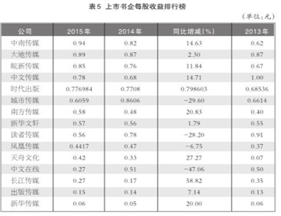 同样的,表5的数据显示,上市书企每股收益的绝对值基本与其净利润相当,而从增长速度来看,长江传媒受营业收入的影响,再度以58.82%的增速荣登榜首;而天舟文化、南方传媒、新华传媒每股收益增长率均超20.00%,分别为27.27%、20.83%和20.00%;中文传媒、中南传媒、皖新传媒每股收益的增长率则介于11%~15%之间,与净利润一样的是,凤凰传媒的每股收益此次也出现下滑,中文在线、城市传媒、读者传媒的每股收益更是分别大幅下滑了47.06%、29.60%、28.20%。