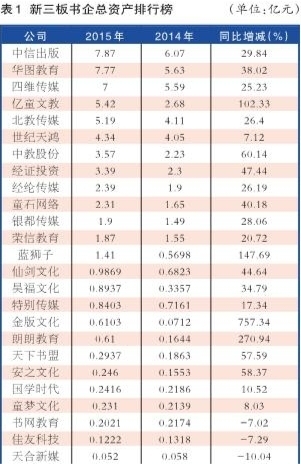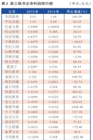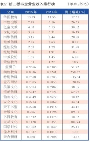 在商报监控的25家新闻出版及关联的新三板企业中,资产规模共计59.76亿元,同比增长39.07%(见表1);2015年的营业收入合计为48.85亿元,同比增长21.22%(见表2)。其中,资产规模突破5亿元的有中信出版等5家,其他20家中1亿元以上规模的有世纪天鸿等8家,仙剑文化等5家规模逾5000万元;营业收入突破1亿元的有10家,华图教育2015年实现营业收入13.59亿元,成为该板块唯一一家突破10亿元营收规模企业;紧随其后的中信出版,实现营业收入7.78亿元;然后依次是亿童文教、世纪天鸿、四维传媒、北教传媒、经证投资、经纶传媒、中教股份和荣信教育。营业收入介于5000万~1亿元之间梯队的有6家,其中蓝狮子以接近1亿元营收领衔。其他9家企业中,营业收入1000万元以上的有8家,天合新媒则以880万元的营收托底。从增速来看,童梦文化、朗朗教育分别以304.94%、258.67%的增长率列居一二。其他23家中,增长逾50%的有金版文化、银都传媒、蓝狮子3家,天下书盟等13家的营收增长率介于10%~45%之间,经纶传媒等4家实现了个位数增长,天合新媒、特别传媒、童石网络则因转型或传统业务影响而营收下滑较大。