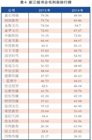 值得一提的是,相对于主板、中小板和创业板,新闻出版及关联的新三板企业毛利率普遍较高(见表4),平均毛利率达49.39%,超过50%毛利率的多达11家,其中童石网络、朗朗教育、金版文化、童梦文化和中教股份毛利率超过70%,分别为79.36%、75.74%、74.54%、72.81%、70.15%。由此也给相关新闻出版及关联的新三板企业带来较好的利润(见表3),其中净利润突破1亿元的有华图教育和中信出版,分别为2.13亿元和1.03亿元;净利润在5000万元以上的还有亿童文教和经证投资,分别为9498万元、5185万元;其他21家企业中,经纶传媒等12家净利润在1000万元以上,朗朗教育等6家净利润突破百万元;而书网教育和童梦文化2015年分别亏损206万元和10万元。