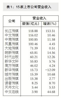 从营业收入来看,中文传媒连续3年独守百亿阵营的格局终于被打破。2015年,营业收入超过百亿元的上市公司达4家,分别是长江传媒、中文传媒、中南传媒、凤凰传媒。