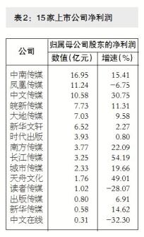 3家公司净利润破10亿元大关,分别是中南传媒、中文传媒、凤凰传媒。其中,中文传媒是首次突破10亿元。中文传媒净利润的增长或与其收购的智明星通有一定关系,2015年度智明星通实现营业收入31.25亿元,净利润3.23亿元,占公司净利润权重为30.56%。