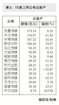15家公司中,9家总资产实现了两位数的中高速增长。其中,中文在线增长最快,总资产翻倍。读者传媒、城市传媒、中文传媒有40%的增长。