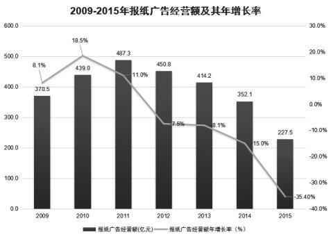 在2015年中国传媒产业发展呈现的几大特点中,《报告》显示,在报纸方面,“断崖”仍在继续,报业面临“生死时速”。2015年传统报业的“断崖式”下跌仍在持续,全国各类报纸的零售总量与2014年相比下滑了41.14%,其中都市报类下滑幅度最大,已达到50.8%。相对稳定的订阅市场在2015年也出现了加速下滑的趋势。传统报刊读者数量和广告收入的双下滑使得近年来报刊经营举步维艰,与之相应的停刊和休刊已成为传统报刊行业的一种“新常态”。据不完全统计,2014年中国停刊或休刊的知名报纸数量约为10家,而2015年这个数字扩大到30家左右。