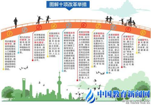 《意见》明确了10项改革举措。一是同步建设城镇学校,要按照城镇化规划和常住人口规模编制城镇义务教育学校布局规划,确保城镇学校建设用地和足够的学位供给。二是努力办好乡村教育,合理布局学校,采取多种措施补齐乡村教育短板。三是科学推进城乡义务教育公办学校标准化建设,改善基本办学条件,提升乡村学校信息化水平和寄宿制学校管理服务水平。四是实施消除大班额计划,到2018年基本消除66人以上超大班额,到2020年基本消除56人以上大班额。五是统筹城乡师资配置,合理核定义务教育学校教职工编制,实行教职工编制城乡、区域统筹和动态管理,完善教师招聘机制,着力解决乡村教师结构性缺员和城镇师资不足问题。六是改革乡村教师待遇保障机制,实行乡村教师收入分配倾斜政策,落实并完善集中连片特困地区和边远艰苦地区乡村教师生活补助政策,确保县域内义务教育教师平均工资收入水平不低于当地公务员的平均工资收入水平。七是改革教育治理体系,提高政府教育治理能力,完善乡村小规模学校办学机制和管理办法,全面加强思想政治教育,逐步形成中国特色的现代学校制度。八是改革控辍保学机制,建立目标责任制和联控联保机制,落实辍学学生劝返、登记和书面报告制度,加大对学习困难学生的帮扶力度,完善资助政策,防止因上学不便而辍学。九是改革随迁子女就学机制,建立以居住证为主要依据的入学政策,推动“两免一补”资金和生均公用经费基准定额资金随学生流动可携带。十是加强留守儿童关爱保护,健全工作体系,促进健康成长。