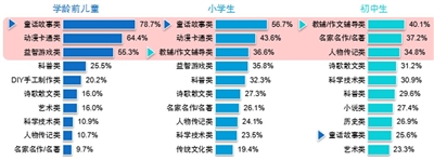此外,童话故事类、动漫卡通类、益智游戏类是儿童喜欢的3大类读物(见图6),这些读物多以绘本的形式呈现。轻松有趣的童话、动漫与游戏最受学龄前孩子欢迎,上学后,教辅书的重要性迅速上升,特别是初中(见图7)。这一结果对出版商和创作者来说极具参考意义。