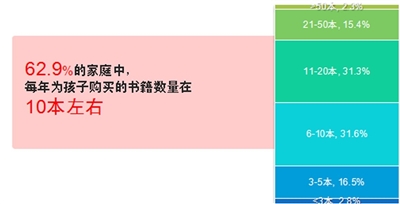 在阅读资源上,73.5%的家庭中,适合孩子阅读的书籍数量超过10本;53.2%的家庭中拥有超过20本适合儿童阅读的藏书(见图11)。实体书店是孩子居所周边最多的资源。62.9%的家庭中,每年为孩子购买的书籍数量在10本左右(见图12),我国童书市场广阔由此可见一斑。