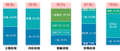 对家长们来说,国内出版物的整体表现一般。其中,装帧表现最不令人满意、设计表现则相对最好(见图13)。学龄前孩子家长更担忧部分图书内容中的低级趣味教坏孩子;小学生家长更烦恼如何从杂乱的种类中给孩子选择适合的书籍;初中生家长更不满市场价格的混乱。与此同时,对于优秀读物,绝大多数家长都表示愿意去购买相关的衍生产品或观看改编的电影作品,电影的吸引力比产品更大。
