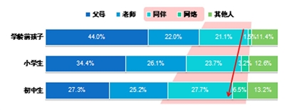 在阅读影响上,父母、老师、同伴是对孩子阅读习惯养成最重要的三类人,其中父母以居于首位(见图14)。父母越重视亲子阅读、亲子阅读开展得越频繁,学龄前孩子就越喜欢阅读。父母自身的阅读量越大,他们也越倾向于为孩子购买、储藏更多书籍,孩子也就读得越多(见图15)。为此,要想孩子养成阅读好习惯,家长还需以身作则。到了初中,同伴和网络的影响力迅速增加。特别是同伴的影响力,已经超越了父母老师,成为主流。