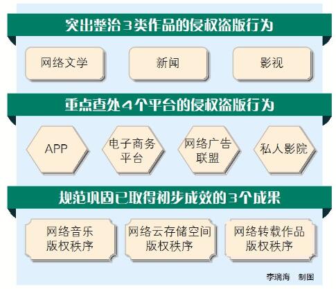 专项行动要求各地版权、互联网信息内容、通信主管、公安等部门加强监测检查,突出查办案件,创新工作方法,完善工作机制,落实主体责任,加强宣传动员,完成3项重点任务:一是开展打击网络文学侵权盗版专项整治行动,加强对文学网站的版权执法监管力度,严厉打击通过网站、贴吧、微博、微信等方式未经授权非法传播网络文学作品的侵权盗版行为,规范通过浏览器、搜索引擎等方式传播文学作品的行为;二是开展打击APP侵权盗版专项整治行动,加强对APP上传者和应用程序商店的版权执法监管,加大对聚合类APP、与网络电视棒及电视机顶盒关联的APP侵权盗版行为的打击力度,强化应用程序商店对提供文学、影视、音乐、新闻等作品APP上传者的版权监管责任;三是开展规范网络广告联盟专项整治行动,加强对网络广告联盟在版权保护方面的监督管理,推动网络广告联盟落实企业主体责任、建立版权保护工作机制,推动版权执法监管机构与网络广告联盟建立切断侵权盗版黑色经济链条的工作机制,严厉打击故意为侵权盗版提供支持的网络广告联盟。