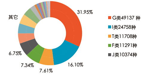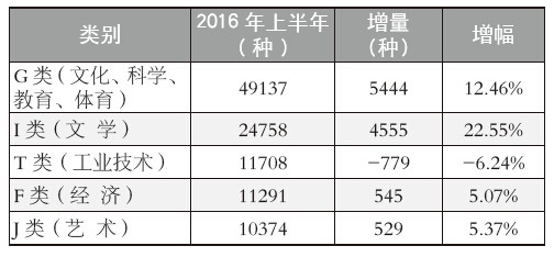 从2016年上半年选题结构分布来看,按照中图法的22个大类划分,与去年同期相比,15个大类上涨,7个大类下降。其中,G类(文化、科学、教育、体育)选题数量增加5444种,同比上涨12.46%;I类(文学)选题数量增加4555种,同比上涨22.55%。