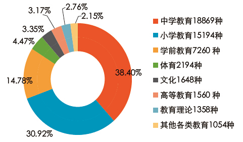 在文化教育类图书的8个细分种类中,学前教育、小学教育和中学教育位居前三,共占比84.10%。其中,中学教育图书最多,占比38.40%;小学教育次之,占比30.92%;学前教育第三,占比14.78%。其余5个细分种类占比不足二成。