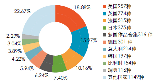 在9443种少儿文学图书中,引进版(包括公版书)占五成多,共5068种,占比53.67%。引进国家和地区共有120余个(引进国家和地区按作者国籍统计),引进数量百种以上共有10个国家和地区,占比77.33%。其中,美国在900种以上;英国在700种以上;法国在500种以上;日本、德国、多国作品合集均在300种以上;意大利在200种以上;韩国、比利时、瑞典均在100种以上。