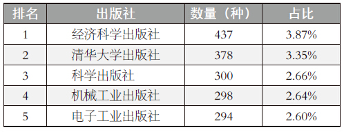 2016年共有456家出版单位出版经济类图书,占全国出版单位七成多,占比76.64%。数量上,经济科学出版社数量最多,约400种以上;清华大学出版社、科学出版社有300种以上;另外,机械工业出版社和电子工业出版社也有将近300种,位列第4和第5名。