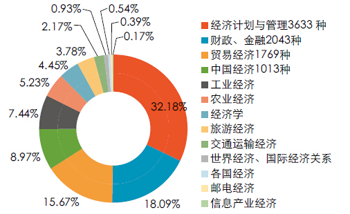 在经济类的13个细分种类中,经济计划与管理选题数量最多,在3000种以上;财政、金融次之,在2000种以上;贸易经济、中国经济均在1000种以上;其余细分种类在1000种以下。