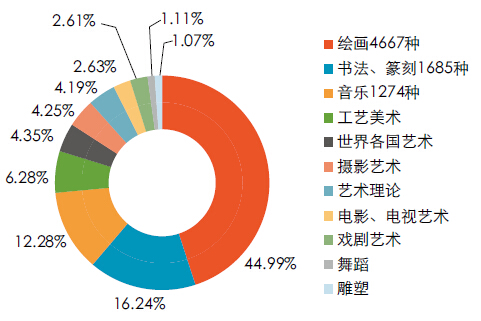 在艺术类的11个细分种类中,绘画图书数量在4000种以上;书法、篆刻图书、音乐图书数量均在1000种以上;其余九类图书数量均在1000种以下。