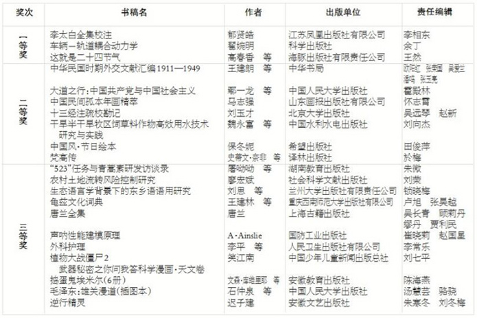 本届活动于2016年初启动,共收到来自200余家出版社符合参评条件的审读报告300余份。经过初评、复评等环节,共推介作品58篇,其中一等奖3篇,分别来自于江苏凤凰出版社有限公司的《李太白全集校注》、科学出版社的《车辆-轨道耦合动力学》、海豚出版社有限责任公司的《这就是二十四节气》;二等奖7篇,分别来自于中华书局的《中华民国时期外交文献汇编1911—1949》、中国人民大学出版社的《大道之行:中国共产党与中国社会主义》、山东画报出版社有限公司的《中国民间孤本年画精萃》、北京大学出版社的《十三经注疏校勘记》、中国水利水电出版社的《干旱半干旱牧区饲草料作物高效用水技术研究与实践》、希望出版社的《中国风·节日绘本》、译林出版社的《梵高传》;三等奖11篇,分别来自于湖南教育出版社的《“523”任务与青蒿素研发访谈录》、社会科学文献出版社的《农村土地流转风险控制研究》、兰州大学出版社有限责任公司的《生态语言学背景下的东乡语语用研究》、重庆西南师范大学出版社有限公司的《龟兹文化词典》、上海古籍出版社的《唐兰全集》、国防工业出版社的《声呐性能建模原理》、人民卫生出版社有限公司的《外科护理》、中国少年儿童新闻出版总社的《植物大战僵尸2 武器秘密之你问我答科学漫画·天文卷》、安徽教育出版社的《捣蛋鬼埃米尔(6册)》、中国人民大学出版社的《毛泽东:雄关漫道(插图本)》、安徽文艺出版社的《逆行精灵》;优秀奖37篇。