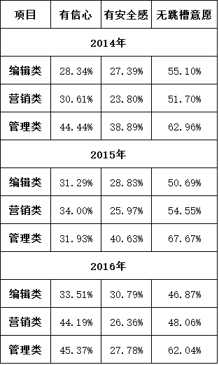 随着出版业整体收入水平的提高,出版从业人员的职业安全感也在进一步提升。尽管认为“薪资水平太低以及不如工资预期”的占比并没有太大变化,但从近三年的调查结果来看,各岗位从业人员的整体信心和职业安全感正在逐年攀升,且跳槽意愿已有所降低。如表2所示,编辑类、营销类、管理类岗位对于职业“有信心”占比分别从2014年的28.34%、30.61%、44.44%上升至2016年的33.51%、44.19%、45.37%,且对职业“有安全感”的占比均有所提高。相应地,“无跳槽意愿”则持续降低。