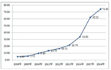 我国成年国民日均手机接触时长连续8年增长,2016年达74.40分钟。(见图1)