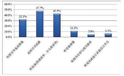 从听书内容来看,在有过听书行为的国民中,有47.7%的人选择“收听评书联播”,有42.5%的人选择“听故事(情感故事、少儿故事等)”,32.3%的人选择“听图书节选或连载”,11.2%的人选择“听诗歌朗诵”,6.2%的人选择“听英语或进行其他语言学习”,5.0%的人选择“听图书介绍与图书推荐”。(见图4)