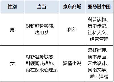 在性别喜好、年龄段喜好等方面,各电商用户的阅读偏爱基本相同。如男女性读者的阅读喜好有较明显的性别差异。总体来说,男性更偏“外向”,比较喜爱实用性或科技、思想类的图书,女性则更偏“内向”,比较喜爱情感性或艺术类的图书。