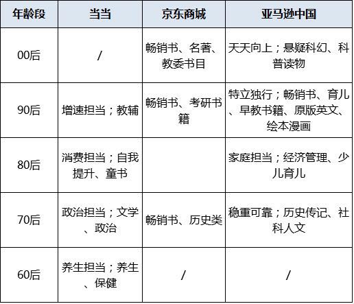 各个年龄段的读者阅读喜好也存在差异。除去各年龄段均爱读的畅销书外,00、90后以学习为主,教辅、考研书籍、原版英文等购买较多;80后肩负家庭与事业,购买图书则以儿童图书、自我提升、经济管理为主;70后人至中年,阅历渐丰,政治、文学、历史等社科类图书便成为心头之爱;60后已知天命,更关注养生保健类图书。