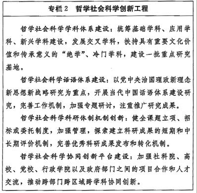 (二)繁荣发展哲学社会科学。坚持马克思主义立场观点方法,按照立足中国、借鉴国外,挖掘历史、把握当代,关怀人类、面向未来的思路,着力构建中国特色哲学社会科学。建立健全哲学社会科学管理体制,加强哲学社会科学创新平台、研究基地、传播中心建设。加强话语体系建设,注重以我为主设置议题,积极开展中国哲学社会科学国际学术研讨活动。举办当代中国马克思主义论坛系列理论研讨会。加强对各类讲座论坛、社科机构的引导和管理。发挥国家哲学社会科学基金示范引导作用,强化考核评价工作。充分发挥中国特色新型智库作用,形成定位明晰、特色鲜明、规模适度、布局合理、能进能出的中国特色新型智库体系。扶持哲学社会科学优秀著作出版。编写哲学社会科学普及读本。