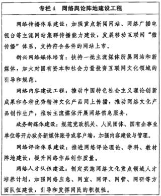 中央网信办、文化部、新闻出版广电总局要根据本规划纲要,抓紧制定本领域的专项规划,报中央文化体制改革和发展工作领导小组批准后实施。国家发展改革委、财政部、国土资源部、商务部、税务总局等要按照职责分工,切实落实有关政策,做好各项重点工程的实施和保障。中央文史馆、国务院参事室等相关部门要积极发挥作用。各地要结合实际,编制好本地区文化发展改革规划。各地区各有关部门要加强对本规划纲要实施情况的跟踪分析和监督检查,推动各项任务措施落到实处。