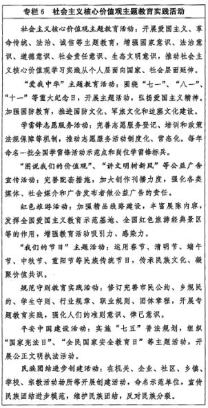 (一)推进社会主义核心价值观学习实践具体化系统化。加强对社会主义核心价值观的研究阐释和宣传普及,充分运用各类媒体、文艺作品、公益广告和群众性文化活动等开展主题宣传。强化实践养成,注重典型示范,开展文化培育,精心设计开展多样化的人民群众喜闻乐见的活动。修订和实施爱国主义教育实施纲要,丰富教育内容、创新教育载体,增强中华民族归属感、认同感、尊严感、荣誉感和命运共同体意识。把社会主义核心价值观纳入国民教育体系,增强学生爱国精神、社会责任感和实践创新能力。发扬红色传统、传承红色基因,用好革命历史类纪念设施、遗址和各类爱国主义教育示范基地等红色资源。弘扬社会主义法治精神,把社会主义核心价值观融入法治建设,推动公正文明执法司法,彰显社会主流价值。推动社会治理体现社会主义核心价值观要求,强化公共政策的价值导向,探索建立重大公共政策道德风险评估和纠偏机制。