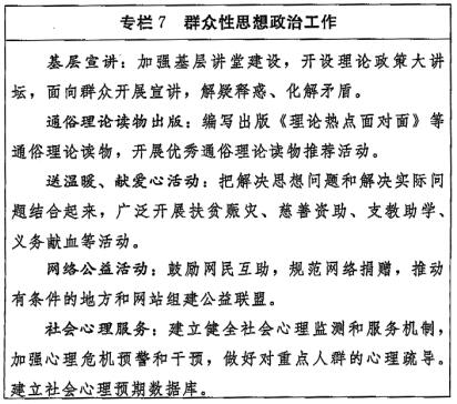 (二)加强和改进群众性思想政治工作。加强对社会热点难点问题的应对解读,合理引导社会预期,组织开展理论宣讲和形势政策教育,设计有特色有实效的活动载体。推动基层党组织、基层单位、城乡社区有针对性地加强思想政治工作,创新新经济组织和新社会组织的思想政治工作方式。加强青少年思想政治工作。加强高校思想政治建设。持续深入推进“基层工作加强年”活动。健全人文关怀和心理疏导机制,培育自尊自信、理性平和、积极向上的社会心态。