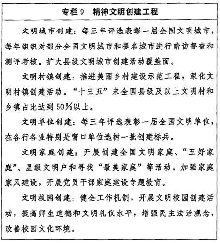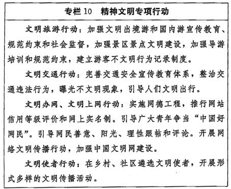 (四)深化拓展群众性精神文明创建活动。广泛开展群众性精神文明创建活动,修订完善各类创建测评体系。加强和改进文明城市创建管理,培育城市精神。加强农村精神文明建设。加强文明行业文明单位创建。培育优良家风家教,传承优良校风校训。针对群众反映强烈的突出问题,开展专项文明行动。完善文化科技卫生“三下乡”长效机制。倡导文明健康生活方式。制定国家礼仪规程。实施全民文明礼仪教育养成行动,培育文明行为习惯。规范升国旗仪式、成人仪式、入党入团入队仪式等礼仪制度。广泛开展军民警民共建精神文明活动。落实党和国家有关政策规定,加强对各类评比活动的规范管理。