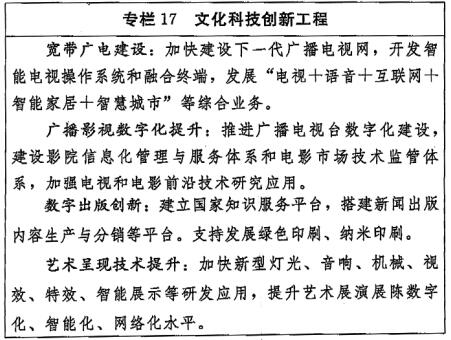 (四)强化文化科技支撑。落实中央财政科技计划管理改革的有关要求,通过优化整合后的科技计划(专项、基金等),支持符合条件的文化科技项目。运用云计算、人工智能、物联网等科技成果,催生新型文化业态。加强虚拟现实技术的研发与运用。推动“三网融合”。制定文化产业领域技术标准,深入推进国家文化科技创新工程。依托国家级文化和科技融合示范基地,加强文化科技企业创新能力建设,提高文化核心技术装备制造水平。加强文化资源的数字化采集、保存和应用。