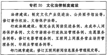(二)完善文化管理体制。加快文化立法进程,强化文化法治保障,全面推进依法行政。抓好公共文化服务保障法、网络安全法、电影产业促进法等法律的实施。深化文化行政管理体制改革,推动政府职能转变,赋予文化企事业单位更多的法人自主权。健全互联网管理领导体制,加强互联网文化管理法规制度建设,完善有关管理工作联动机制。健全国有文化资产管理体制机制。深化文化市场综合行政执法改革,理顺执法机构与有关行政管理部门之间的关系,全面落实行政执法责任制。推进文化类社会组织和行业自律建设,深化文联、作协、记协改革。