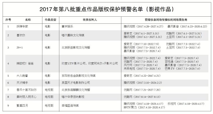 按照《国家版权局办公厅关于进一步加强互联网传播作品版权监管工作的意见》及国家版权局版权重点监管工作计划,根据相关网络服务商上报的获得作品授权的情况,现公布2017年度第八批重点作品版权保护预警名单。