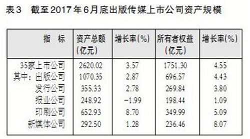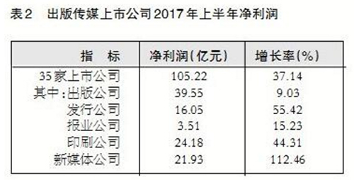 截至2017年6月底,35家在内地主板和创业板上市的出版传媒公司拥有资产总额2620.02亿元,所有者权益1751.30亿元;上半年实现营业收入654.17亿元,净利润105.22亿元。出版传媒上市公司经营规模持续扩大,净利润高速增长,总体保持稳健发展态势。