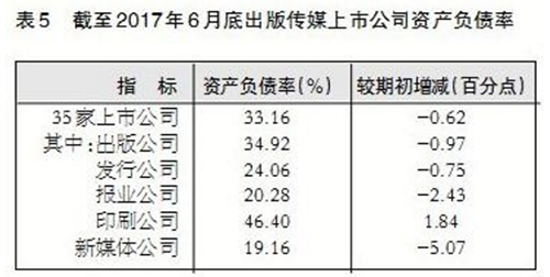 截至2017年6月底,35家出版传媒上市公司资产负债率为33.16%,较期初降低0.62个百分点,杠杆率持续下降,个别公司长期偿债能力提升明显。