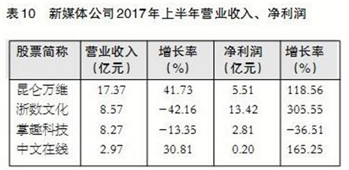 其中,中文在线、昆仑万维营业收入、净利润高速增长,发展势头稳定。浙数文化剥离传统新闻传媒类资产,交易对价19.97亿元,影响公司当期净利润11.74亿元。造成公司当期营业收入同比大幅下降42.16%;净利润13.42亿元,同比增长逾3倍。掌趣科技受游戏业务下滑影响,营业收入同比下降13.35%,净利润同比下降36.51%,报告期内通过林芝腾讯持股实现了腾讯战略入股。(详见表10)