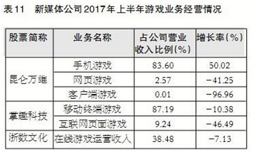 各公司游戏业务呈现逐步由页面游戏、客户端游戏向手机游戏转移的趋势。报告期内,昆仑万维全面压减了页面游戏和客户端游戏的收入规模,公司业务进一步向手机游戏集中,手机游戏的占比已经达到了83.60%。掌趣科技互联网业务游戏(-46.49%)的降幅远高于移动终端游戏(-10.38%),移动终端游戏收入的占比提升至87.19%,2017年5月、6月新上线的游戏《神话永恒》《魔法门之英雄无敌:战争纪元》均为手机游戏。浙数文化在保持PC棋牌业务稳定发展的基础上,全力拓展移动端市场。报告期内,旗下杭州边锋在浙江省内推出了《杭麻圈》《丽水茶苑》等10余款地方性的移动端棋牌游戏,并通过投资乐玩、收购深圳天天爱科技,布局全国市场。(详见表11)