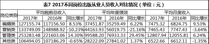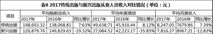 数据显示,2017年传统从业人员平均税前总收入为148603.32元,新兴出版从业人员为120879.76元。前者比后者高出22.93%,无论是平均年度绩效还是平均月度收入,传统出版从业人员均高于新兴出版从业人员。