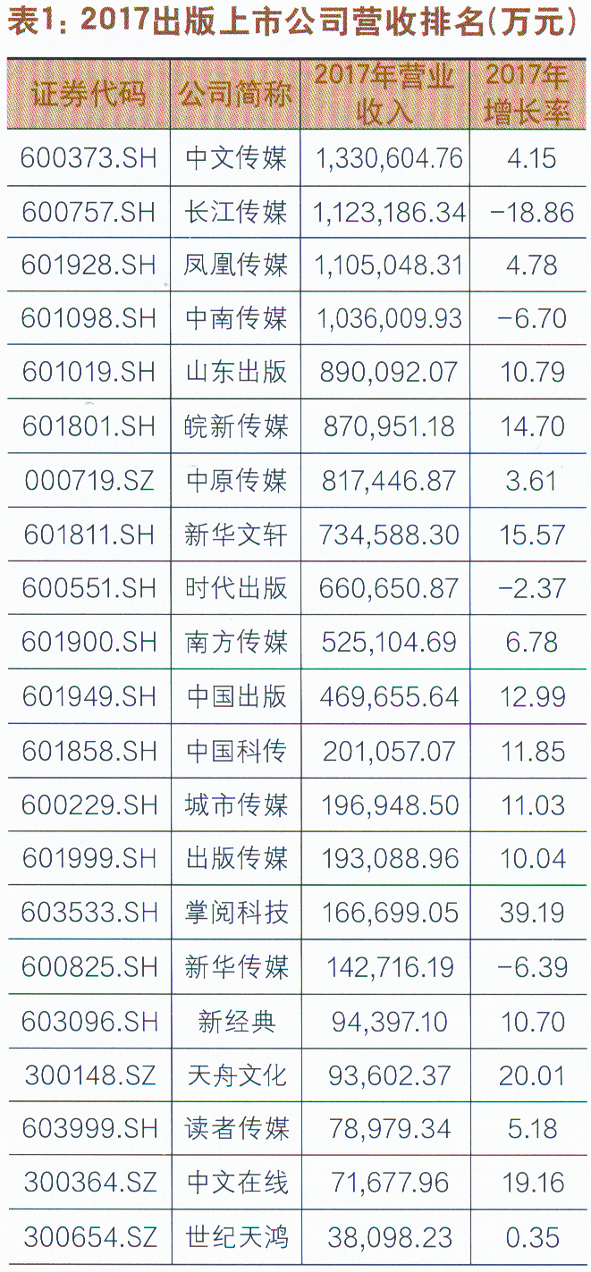 截至2018年4月28日,沪深两市共有出版传媒上市公司21家,分别为长江传媒、新华传媒、出版传媒、时代出版、中文传媒、中文在线、凤凰传媒、中南传媒、皖新传媒、大地传媒、天舟文化、城市传媒、读者传媒、新华文轩、南方传媒、中国科传、新经典、中国出版、掌阅科技、世纪天鸿、山东出版。