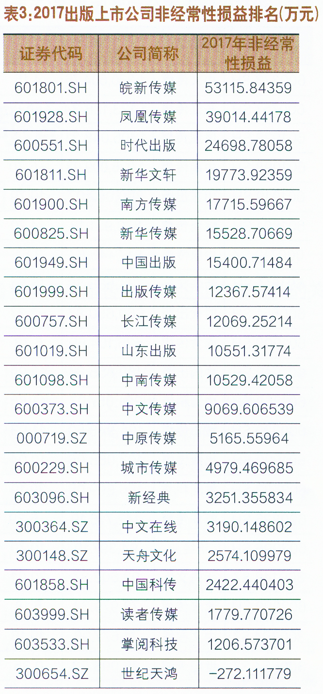 在财报当中,非经常损益也会影响出版上市公司的利润表现,在这一项中,皖新传媒以5.3亿元高居榜首,主要来源是4.09亿元的非流动资产处置损益,虽然本次财报并没有解释该项,不过通过查阅往期公告发现,“公司以持有的16处自有门店物业开展相关创新型资产运作模式,直接影响4.09亿元的净利润”,实际是通过产权交易中心出售门店的100%股权及全部相关权益再以市场价租回经营。除此之外,多数出版上市公司的非经常性损益主要为政府补贴,凤凰传媒、时代出版、新华文轩等10家公司的非经常损益均在1亿以上。