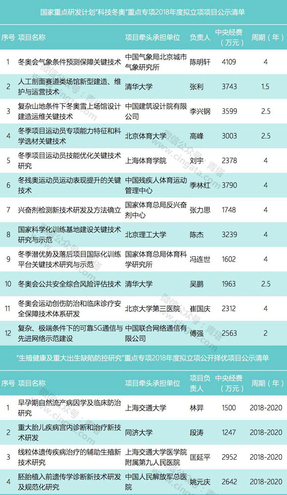近日,科技部公示了国家重点研发计划“科技冬奥”重点专项和“生殖健康及重大出生缺陷防控研究”重点专项公示清单,项目共有16个,总经费共有4.23亿元。