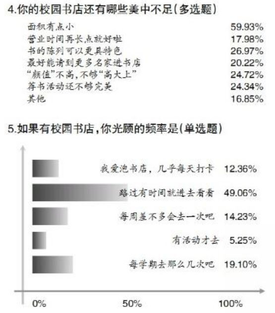 55.06%的被调查者表示自己校内有书店,但这些书店尚有一些美中不足。比如,59.93%的大学生认为,书店面积有点小,26.97%的学生认为书的陈列可以更具特色,24.34%的学生认为荐书活动还不够完美。此外,19.10%的被调查者说,校园书店蜗居在角落里,教材之类是其“主菜”。