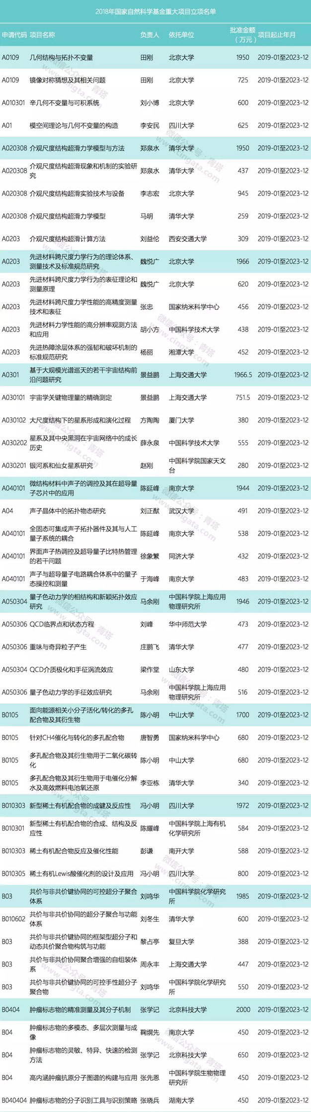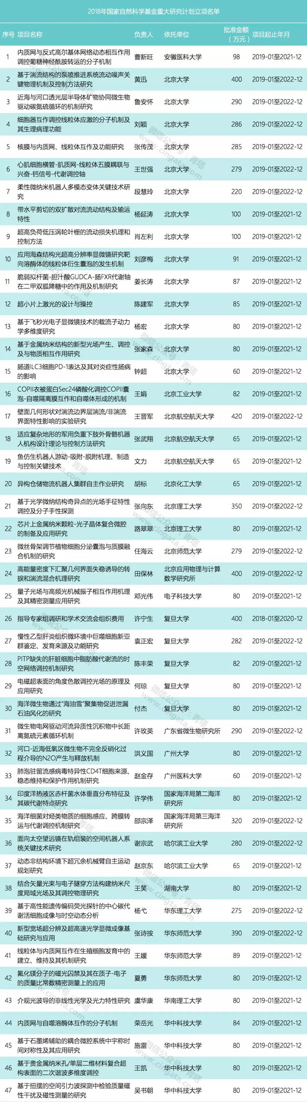 近日,国家自然科学基金委员会更新了科学基金网络信息系统,公布了2018年集中受理期未公布的部分项目。这些获资助项目主要是金额较大、含金量比较高的重大项目,包括国家杰青项目、重大仪器项目(部门推荐)、创新研究群体项目(延续资助项目)、重大项目、重大研究计划项目等。