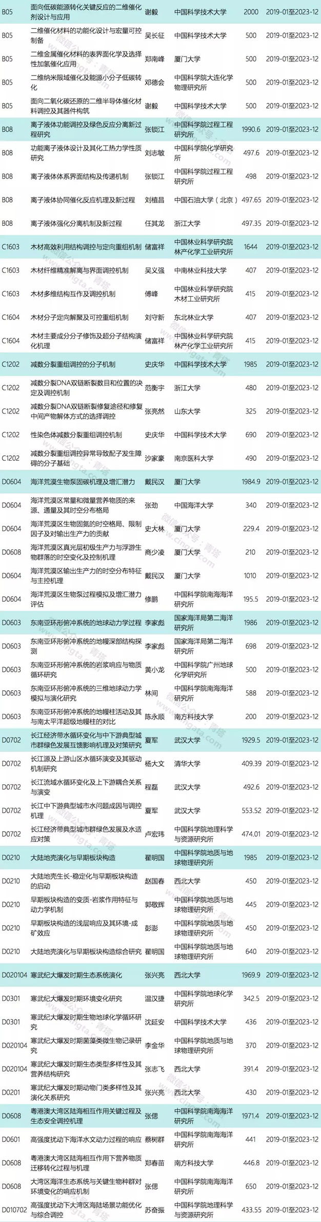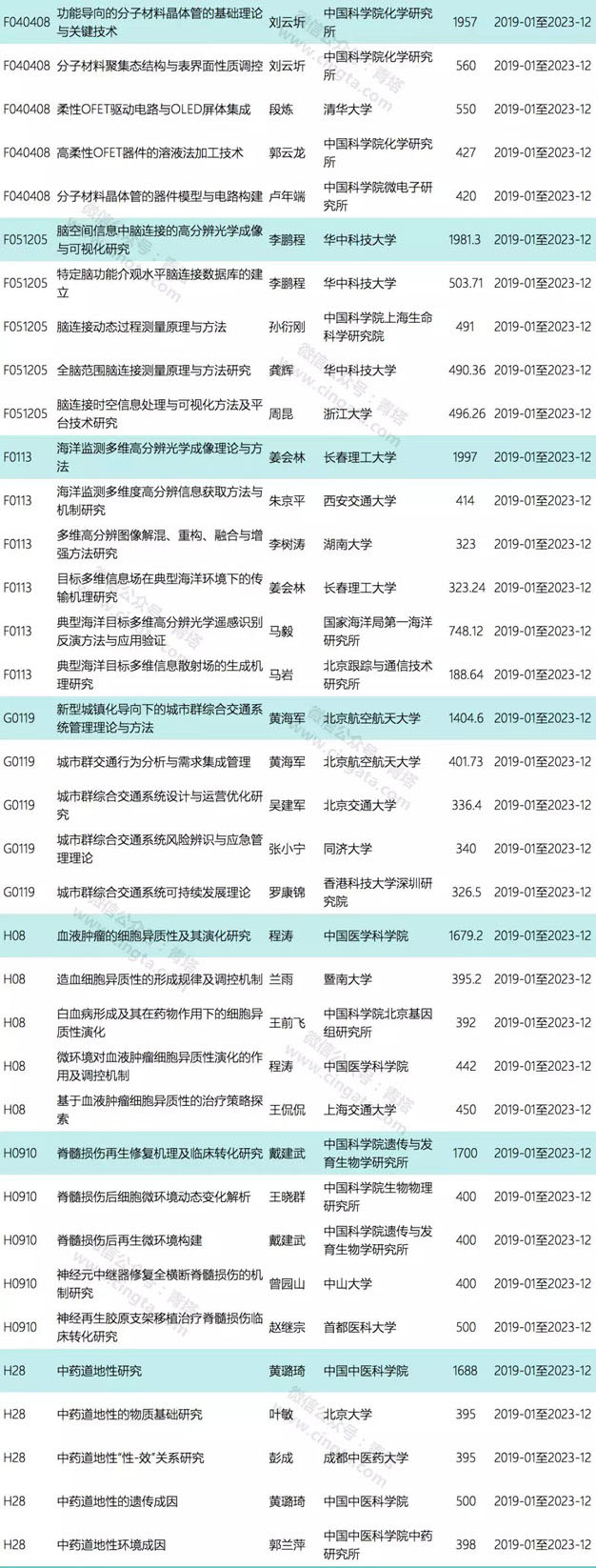 值得注意的是,从2019年开始,国家自然科学基金委将对创新群体项目进行改革,包括缩短资助期限(在资助强度保持不变的情况下,资助期限由6年缩短为5年)、增加资助规模(由之前的每年38项增加到46项,每个科学部在原有指标基础上各增加1项)、取消延续资助((在研(2013-2018年批准资助)和新批准(2019年及以后批准资助)创新研究群体项目不再实行延续资助)。这也意味着,这10个项目将是最后一批创新研究群体延续资助项目。