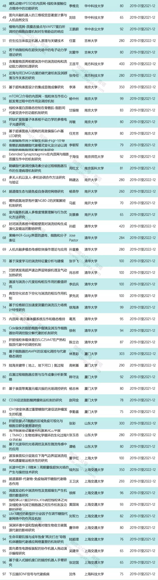 本次公布的项目为创新研究群体延续资助项目,共有10个项目获资助(单个项目的资助强度约为367万或525万)。10个项目来自8家单位,其中北京大学和浙江大学各有2项获资助。