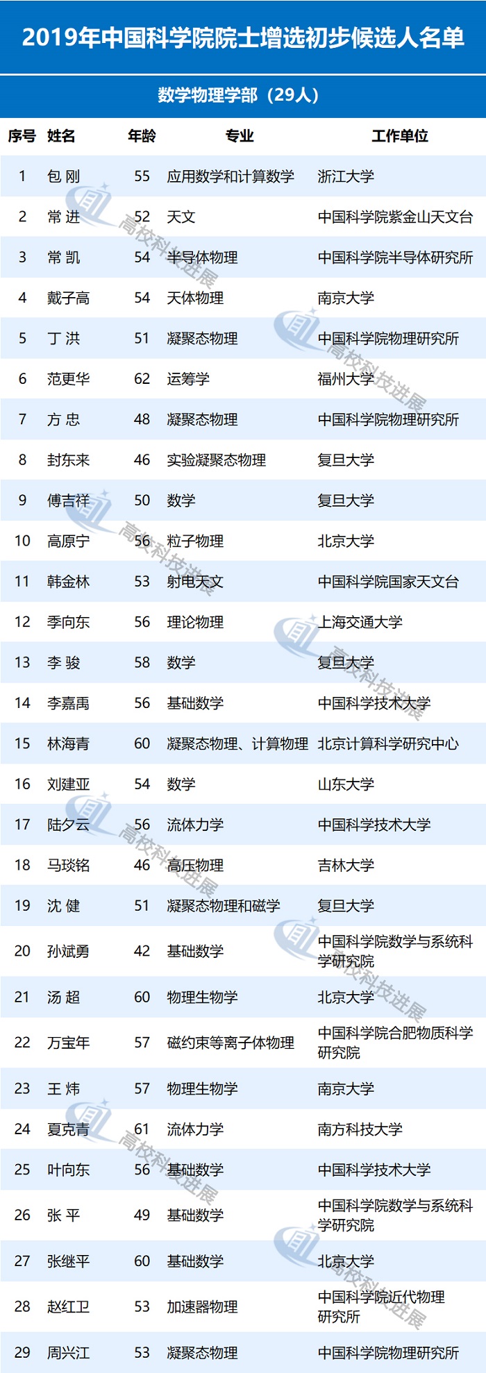 8月1日,中国科学院公布2019年中国科学院院士增选初步候选人名单,共计有181位科学家入选,其中数学物理学部29人、化学部28人、生命科学和医学学部32人、地学部27人、信息技术科学部26人、技术科学部39人。