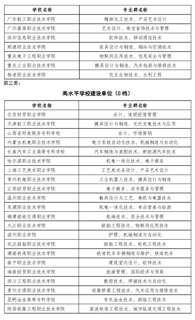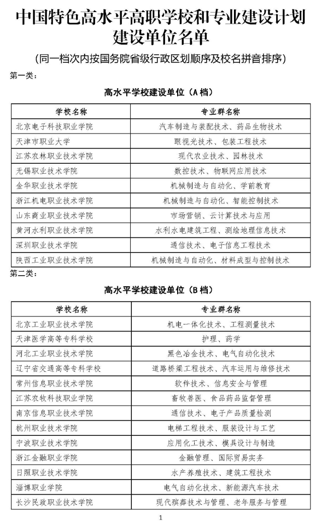 根据《教育部 财政部关于实施中国特色高水平高职学校和专业建设计划的意见》(教职成〔2019〕5号)和《中国特色高水平高职学校和专业建设计划项目遴选管理办法(试行)》(教职成〔2019〕8号),经高职学校自愿申报,省级教育行政部门、财政部门审核推荐,中国特色高水平高职学校和专业建设计划(简称“双高计划”)项目建设咨询专家委员会评审,教育部、财政部审定并公示,现对“双高计划”第一轮建设单位名单予以公布。