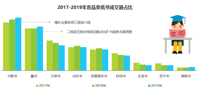 从品类来看,近三年文教书、童书和文学书三种图书类型稳居成交额前三。