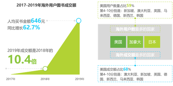 报告中值得关注的一点是,2019年京东图书在海外销售呈爆发式增长,成交额是2018年的10.4倍;海外用户人均买书花费646元,同比增长62.7%;美国、加拿大和日本成为京东图书海外前三的市场。